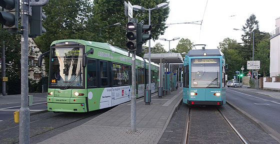 Frankfurtin molemmat raitiovaunutyypit päätepysäkillä Offenbach Stadtgrenze. Vasemmalla mainosteipattu S-sarjan vaunu, oikealla 2020-luvun alussa poistuva R-sarjan vaunu. Vaunut ovat kahteen suuntaan ajettavia. Kuva 2.7.2019 Antero Alku.