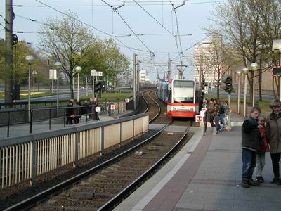 Heumarktin asema Kölnissä on maan pinnalla, mutta liikenne toimii yhtä tehokkaasti kuin metrotunnelissa. Raideliikenne on täysin eristetty viereisen kadun autoliikenteestä. Matalan laiturin ja ilmajohdon ansiosta kulku laiturilta toiselle on vaivatonta ja nopeata. Pyöräilijät jättävät plkupyörät laiturin jatkeen telineeseen.