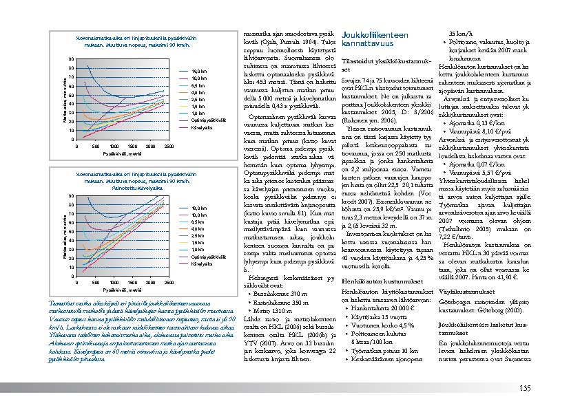 Teoreettiset matka-aikakäyrät eri pituisille joukkoliikenteen vaunussa matkustetuille matkoille yhdessä kävelyaikojen kanssa pysäkkivälin muuttuessa. Vaunun nopeus kasvaa pysäkkivälin mahdollistavaan nopeuteen, mutta ei yli 90 km/h. Laskelmassa ei ole raskaan raideliikenteen tasonvaihtoon kuluvaa aikaa. Yläkuvassa todellinen kokonaismatka-aika, alakuvassa painotettu matka-aika. Alakuvan optimikuvaaja on painottamattoman matka-ajan asettamassa kohdassa. Kävelynopeus on 60 metriä minuutissa ja kävelymatka puolet pysäkkivälin pituudesta.